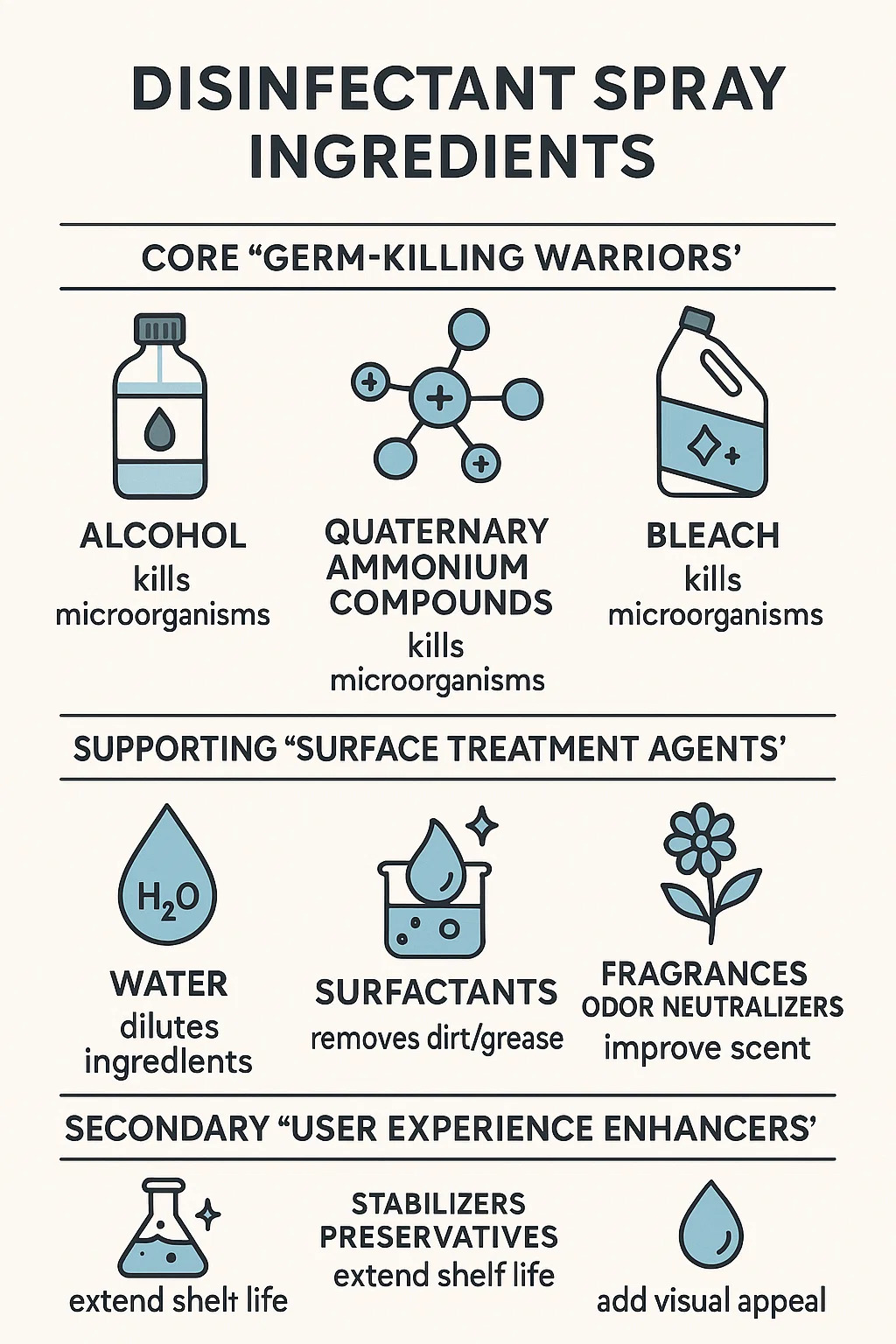 To create an effective disinfectant spray, the main "hero" ingredients can be broadly categorized as follows: 1....